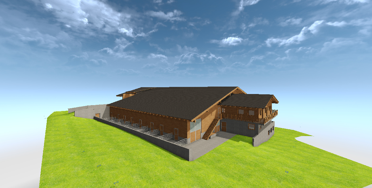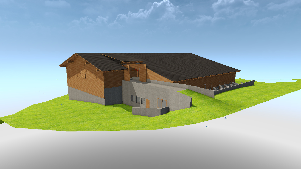 Neben dem Laufstall für die Rinder beherbergt das neue Gebäude außerdem einige Pferdeboxen mit Paddocks sowie Räume für Gerätschaften und die technische Ausstattung des Stalls.